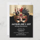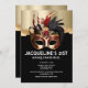 Un beau masque faux or à oeil a une garniture rouge autour du dessus des yeux; un ligree floral décoratif au milieu; une rose rouge et des plumes molles noir, rouge et or sur le dessus qui reposent contre un faux shimmer, or brillant et arrière - plan noir. Les modèles de texte modifiables en blanc apparaissent sous le graphique aquarelle ai pour votre libellé personnalisé. Ce design est idéal pour un glam et une luxueuse bachelorette, douche nuptiale, anniversaire, sweet sixteen ; jalon ou soirée quinceanera. Personnalisez simplement les modèles de texte modifiables pour convenir à votre occasion spéciale.
