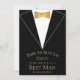 La partie supérieure suggère un costume noir élégant avec chemise blanche et cravate dorée de fausse feuille d'or. Dans la partie inférieure, le message "Time to suit up" est placé au-dessus du message "votre service en tant que Groomsman est demandé", avec les mots Best Man en casquette plus grand. Le nom et le rôle Best Man sont dorés, le reste du texte est blanc. l'arrière - plan est noir. Au dos, il y a un message dans un script d'écriture blanche, également sur un arrière - plan noir.