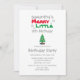 Le thème de Noël des enfants joyeuses petites invitations d'anniversaire. L'Invitation propose un thème de vacances rouge et vert avec des flocons de neige gris, un sapin de Noël et des cadeaux
