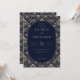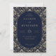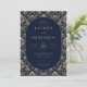 This is a classic style image featuring an elegant wedding invitation for Lauren and Benjamin. The design showcases intricate gold floral patterns on a deep navy background, creating a luxurious and sophisticated look. The oval centerpiece elegantly displays the couple's names along with the date and venue details in crisp white text. It exudes a sense of timeless elegance and formality, perfect for setting the tone for a grand celebration. Ideal for those seeking a traditional yet refined aesthetic for their special day.