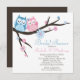 Invitation nuptiale de douche de couples contemporains. Notre couple élégant, à la mode et moderne de hibou dans l'invitation de wedding shower d'amour est placé sur un arrière - plan blanc croquant carré avec un brun de retour. Les hiboux roses et bleus mignons couplent se reposer sur des fleurs de marguerite rose et bleue d'une branche d'arbre brune.