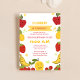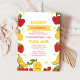 le design montre une invitation à l'anniversaire pour les enfants en jaune et rouge entourés de beaucoup de fruits. le design est extrêmement mignon et unique et sera idéal pour tous les enfants.