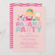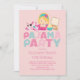 L'invitation mignonne de partie de sleepover comportant une fille blonde sur un coussin avec une cuvette de maïs éclaté, de pizza et d'articles de maquillage a placé sur un arrière - plan rose-clair chic. Notre invitation élégant, moderne et d'amusement de pyjama de partie a la typographie de chevron laisser dans le rose, le bleu de turquoise et rose-clair. Renversez notre invitation de soirée pyjamas plus de pour regarder un dos coordonné de rayure de chevron pour un contact spécial supplémentaire. Perfectionnez pour une fête d'anniversaire de tween ou la fête d'anniversaire d'ado.