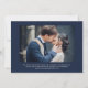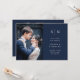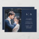 Ces invitations de mariage élégantes et modernes présentent un design de texte simple bleu marine et blanc qui respire le style minimaliste, avec deux de vos photos personnelles préférées. D'autres détails mariages ou le site Web peuvent aller à l'arrière. Ajoutez vos initiales ou votre monogramme pour les rendre complètement vôtres.
