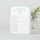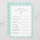 Titre du jeu et questions textuelles pour baby shower ou douche nuptiale. Dispose d'un arc peint à la main avec en vichy cadre et dossier Mint Green plaid.