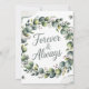 Une carte de voeux mariage délicate avec une couronne d'eucalyptus à l'aquarelle magnifiquement détaillée dans les tons vert menthe et vert sauge, encerclant un arrière - plan blanc texturé et subtil. La couronne comprend des sprigs épars de la respiration du bébé et de minuscules accents perles, créant une atmosphère élégante et un peu rustique, avec une douce lueur qui améliore l'effet d'aquarelle. De l'autre côté de la couronne, le texte "FOREVER & TOUJOURS" est affiché dans une police de texte fluide et moderne dans un gris argenté doux, complétant les tons naturels et évoquant un sentiment de romantisme intemporel. L’intérieur de la carte offre un espace suffisant pour un message sincère et intègre une illustration simplifiée de l’eucalyptus dans le coin inférieur, en maintenant le ton émotif serein et festif.