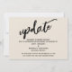 La particularité de cette suite est due à la police moderne et manuscrite utilisée pour les phrases d'accentuation. Dans le cas où vous auriez besoin de faire savoir à vos invités que votre mariage a été annulé, cette carte propose une option audacieuse et accrocheuse. Dans ce modèle, la police manuscrite a été utilisée pour créer un graphique qui indique "mise à jour". Utilisez les champs du modèle pour ajouter vos informations personnelles et rendre ce design moderne et unique vôtre. L'arrière-plan peut être changé en n'importe quelle couleur de votre choix. N'hésitez pas à nous contacter pour toute demande spéciale ou pour une aide à la personnalisation. // 100 //