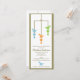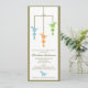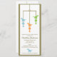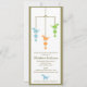 Trois dinosaures mignons dans le coup bleu, vert, et orange d'un mobile à cette invitation adorable de baby shower.