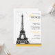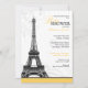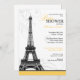 Invitations Jaunes : Invitations élégantes et modernes parisiennes de douche bébé avec une tour Eiffel à échelle grise au-dessus d'une bordure jaune au fond, avec des fleurs gris clair derrière.