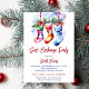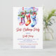 Chaussettes d'aquarelle de fête de Noël accrochées à un ruban rouge sur une branche de pin flocons de neige police décontractée modèle invitation instantanément télécharger.