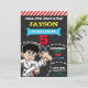 MODELE D'INVITATION D'ANNIVERSAIRE GARÇON KARATE KID FÊTE D'ANNIVERSAIRE NINJA, FOND NOIR, LETTRES TABLEAU NOIR, COULEURS PASTEL JAUNE, VERT, ROUGE, BLEU