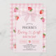 Berry first birthday invitation template for girl featuring various strawberries and white daisies on a pink gingham pattern background and arch. This berry first birthday invitation also features a pink bow, heart font heading and is ideal for a girls berry themed first birthday party.