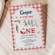 Boys first birthday fishing themed invitation featuring a fishing rod, lures, fish, dragonflies and worm on an arch and red gingham pattern background.