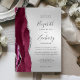 Le bord gauche de cette élégante faire-part de mariage moderne est orné d'une bordure d'aquarelle bordeaux et d'une fausse parties scintillant argentée. Le texte personnalisable combine écriture manuscrite grise au fusain, copperplate et polices italiques sur un faux arrière - plan argenté. L'envers est assorti d'un design d'agate bordeaux et argenté.