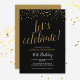 Parfait pour un prochain anniversaire, cette invitation peut être customisée à tout âge. Sur un arrière - plan noir, il y a de petits coeurs de parties scintillant d'or en haut, sous l'élégante typographie de script d'or dit "fêtons !". En dessous, dans un mélange de typographie blanche et or, vous pouvez facilement personnaliser avec votre nom, les détails de la fête et l'âge célébré. Le dos de l'invitation a un arrière - plan d'or.