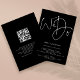 Écriture moderne Nous nous marions Code QR Mariage Noir Ajoutez votre code QR à votre site web de mariage au dos, cela en fait une option pratique pour que vos invités répondent et voient tous les détails sans avoir besoin de cartes de réponse et de détails séparées. Une typographie blanche sur un design noir élégant. Un ensemble élégant d'écriture Nous nous marions prend la vedette en haut. Vous pouvez facilement personnaliser le reste du texte. Les couleurs du texte et de l'arrière-plan peuvent être modifiées si vous le souhaitez pour mieux correspondre à votre thème de mariage via l'option de personnalisation avancée.