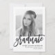 Invitations amis et famille votre fête de remise des diplômes avec une invitation chic et moderne de remise des diplômes. Le design comprend une police de script tendance, des espaces réservés pour une image et un texte personnalisé, et un motif art déco noir et blanc à l'arrière.
