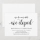 Cette carte d'invitation sur le thème rustique (Nous allons, nous sommes allés, nous nous sommes enfuis) est parfaite pour votre célébration de mariage en fuite / annonce de fête. Ajoutez vos coordonnées dans une police / lettrage noir assorti.
