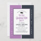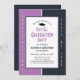 Invitation de graduation moderne et élégante en mauve et bleu. FÉLICITATIONS est écrit verticalement sur le côté et CLASSE DE 20XX sur l'autre côté. Les deux sont personnalisables. Arrière - plan bleu clair avec GRADUATION en motif carrelé subtil. Le texte de l'espace réservé est personnalisable, alors ajoutez simplement votre nom et vos détails. Une partie de la collection GRADUATION par Berean Designs.