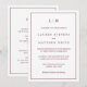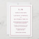Faire-part de mariage tout-en-un simple, moderne et élégant, avec votre monogramme à deux lettres en haut et vos détails entourés d'une fine bordure. Tous les éléments de conception sont bordeaux sur un arrière - plan blanc et peuvent être changés en n'importe quelle couleur que vous souhaitez dans l'outil d'édition de conception. L'arrière dispose de tous vos détails mariages, éliminant le besoin d'une carte d'enceinte séparée, ce qui en fait une suite de faire-part de mariage économique. Un design chic et design qui conviendra à un couple minimaliste.
