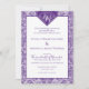 Élégant damas royal violet sur gris argenté avec majestueux mariage de bannières de protection dans une police manuscrite. Faire-part de mariage monogramme nouveau et tendance avec un libellé original et différent de faire-part de mariage à la première personne.