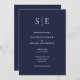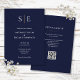 Ce faire-part de mariage chic, minimaliste, bleu marine et or peut être personnalisé avec vos initiales monogrammes et informations de mariage. Avec les détails de votre site Web mariage et votre code QR au verso. Conçu par Thisisnotme©