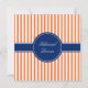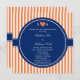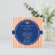 L'arrière - plan est agrémenté d'un motif à rayures orange et blanches alternant. Le design présente également les initiales de la mariée et du marié séparées par un coeur orange. Un élégant motif rayé et au milieu un cercle bleu royal où ajouter le texte de votre invitation. Répétition des invitations au dîner.