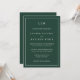 Simple faire-part de mariage vert de forêt avec un design moderne mais élégant avec votre monogramme à deux lettres en haut et vos détails entourés d'une fine bordure. Les polices et les couleurs arrière - plans peuvent être changées en n'importe quelle couleur en cliquant sur le bouton "personnaliser". Un design chic et design qui conviendra à un couple minimaliste.