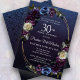 Des roses et des fleurs sauvages chics et mauves, sophistiqués et mauves, créent un design floral chic. Des côtelettes de blanc et de bleu ajoutent un intérêt visuel et une profondeur. Les baies et les fruits ajoutent au design sulfureux. Ensemble, elles décorent un cadre en or ovale à plusieurs brins élégant. L'invitation en retour a un motif vintage géométrique subtil. Cette invitation de 30e anniversaire fait partie de la collection Moody Purple Floral. Il contient des modèles que vous pouvez utiliser pour créer une suite d'invitation unique, ainsi que des modèles pour des panneaux d'accueil, des fournitures de fête et des décorations.