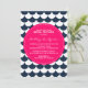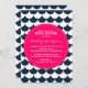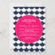 Motif de pétoncle rose et marine Invitation de douche nuptiale Invitation de douche nuptiale avec pétoncle bleu marine et blanc / vagues motif et badge rose chaud. Moderne et capricieux - parfait pour les douches à thème de plage et nautique.
