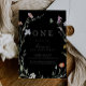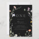 Cette invitation à fêter son premier anniversaire à fleurs multicolores est parfaite pour une fête d'anniversaire moderne. Le design est composé de fleurs élégantes rose aquarelle, rousse, violette, marine et blanche avec des feuilles vert émeraude dans un arrière - plan foncé.