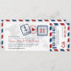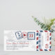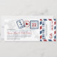 Une carte d'embarquement a inspiré l'invitation de billet avec des détails de timbre de passeport d'amusement et des rayures de par avion. Montré dans les nuances de la marine, du rouge, et du gris. Le dos inclut l'espace supplémentaire pour n'importe quelle information d'hôtel, de voyage ou de site Web.