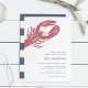 L'invitation à la douche nuptiale chic côtière présente une illustration de homard de style gravé vintage en rouge muet, avec les détails de votre douche nuptiale en bleu marine classique. Parfaites pour les douches nuptiales à thème de plage, d'été ou nautique, ces invitations de style côtier renversent à de larges bandes horizontales en bleu et blanc du port.