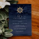 Cette barre de navire nautique moderne fêtons l'invitation est parfait pour une croisière ou un fiançailles de plage, mariage après la fête, la retraite, la remise des diplômes ou tout événement heureux. Le design simple comprend une roue de bateau doré sur un arrière - plan bleu marine aquarelle.
