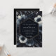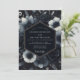A moody aesthetic defines this design with a deep palette of navy blue and charcoal tones. Elegant white anemones contrast against lush charcoal roses and intricate foliage. Delicate gold accents provide warmth amidst the cool, nocturnal botanical scenery. The atmosphere is one of mysterious romance and sophisticated winter beauty.