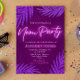 Invitation minimaliste avec lumières néon et le titre pour donner à l'invitation un aspect alléchant avec du violet foncé sur le fond avec des feuilles tropicales scintillantes assorties