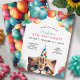Invitations amusantes et colorées à la fête d'anniversaire avec un petit chaton portant un casquette de fête entouré de ballons arc-en-ciel. Les invitations mignonnes qui peuvent être changées à tout âge.