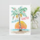 Thème de plage tropical L'invitation à la fête de Noël comprend une île au soleil avec un palmier décoré de lampes à cordes et d'ornements et une légende de "fête de vacances" en lettres style brosse. Art par KL Stock