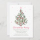 Christmas Party Invitation rouge et blanche conçue avec un arbre de Noël festif décoré de saint rouge et une étoile de Noël. sur un arrière - plan blanc. Le texte comprend : Noël, la date, l'heure, l'emplacement, l'adresse, les détails de l'hôte et du RSVP. Pour personnaliser, insérez simplement votre texte dans notre modèle facile, en remplaçant l'exemple. Assurez-vous de voir les accessoires de fête de Noël correspondants.