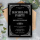 Invitez vos invités avec cette invitation de thème de soirée de bachelor dans le style vintage de Gatsby le Magnifique avec une bordure décorative argentée et une typographie élégante sur fond noir. Ajoutez simplement vos coordonnées dans ce modèle facile à utiliser pour en faire une invitation unique en son genre. Retournez la carte pour révéler un beau motif d'étoiles argentées au verso de la carte.
