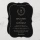 Choix de bon goût et classique dans les invitations de mariage, ce design exprime une élégance simple dans sa disposition de texte et de forme de support. Une simple couronne de laurier ouverte de feuilles esquissés entoure l'initiale monogramme de la mariée et du marié. Le modèle de texte élégant et simple est prêt à personnaliser avec vos détails mariages. Cette invitation est un choix polyvalent pour les mariages à n'importe quelle saison de l'année et pour n'importe quel lieu mariage, qu'il s'agisse d'une cérémonie religieuse solennelle ou d'une affaire de type laïque dans une salle de banquet, un vignoble, un musée, un restaurant, un club privé ou un mariage rustique à l'extérieur dans la nature. Cette invitation est disponible dans une variété de styles de forme (montré ici en noir classique en forme entrelacée) ainsi que de nombreux types de papier et de poids différents.