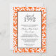 Une invitation orange et noire élégante de réunion de classe, comportant un motif formel de damassé de remous. Perfectionnez pour une invitation de réunion d'invitation ou de classe de réunion de classe de lycée !