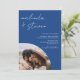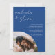 Une invitation de mariage moderne, chic et élégante avec arc, des noms de script avec une calligraphie manuscrite en bleu de l'année et blanc avec une photo voûtée et 3 autres photos à l'arrière. Un tout moderne en un seul faire-part de mariage avec rsvp, détails, hébergement et code qr. Tous les textes, noms et couleurs arrière - plans sont personnalisables. Une invitation simple et minimaliste.