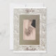 Un motif de défilement beige et ivoire à l'ancienne avec un tapis beige avec la mariée dans le marié tenant la main et le script de fantaisie dans le marron foncé disant Vous êtes invité sur le devant et le même script avec la date, l'heure et la place sur le dos. Correspondance d'enveloppes brunes profondes et de timbres-poste mariages.