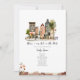 Baby shower garçon avec aquarelle illustration de la rue de la ville avec ballon rose attaché à un lampadaire avec poussette garée sur le trottoir. Le fond est orné d'une bordure en brique au design floral.