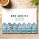 Invitation Nouvelle adresse bleue avec bâtiments de caricatur