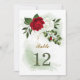 belle carte de numéro de table personnalisable romantique fleurs rouges et blanches avec quelques feuilles verts et parties scintillant d'or carte de numéro de table