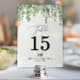 Thème Parties moderne eucalyptus événement / mariage numéro de table design caractéristiques aquarelle eucalyptus vert avec accents dorés. La typographie moderne à lettrés à la main est associée au lettrage serif traditionnel, et le design est placé sur un arrière - plan pastel vert aquarelle couleur pastel. #Mariage #Eucalyptus #MariageRustique