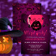 Design Halloween moderne pour fête d'anniversaire spooktaculaire avec citrouille effrayant sur lune rose violet arrière - plan et citrouilles et chauves-souris volantes sur le côté arrière. Un design neutre pour les hommes et les femmes, parfait pour les célébrations d'octobre ! Le modèle de fête d'anniversaire est facile à customiser.