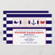 Une invitation orientée de fête d'anniversaire d'océan comportant un arrière - plan des rayures de bleu marine et de blanc sur l'avant et le dos. L'avant comporte des illustrations d'une baleine, de dollar de sable, d'ancre, et d'un crabe à l'intérieur des carrés blancs avec l'équilibre rouge. Personnalisez avec des détails de votre occasion.